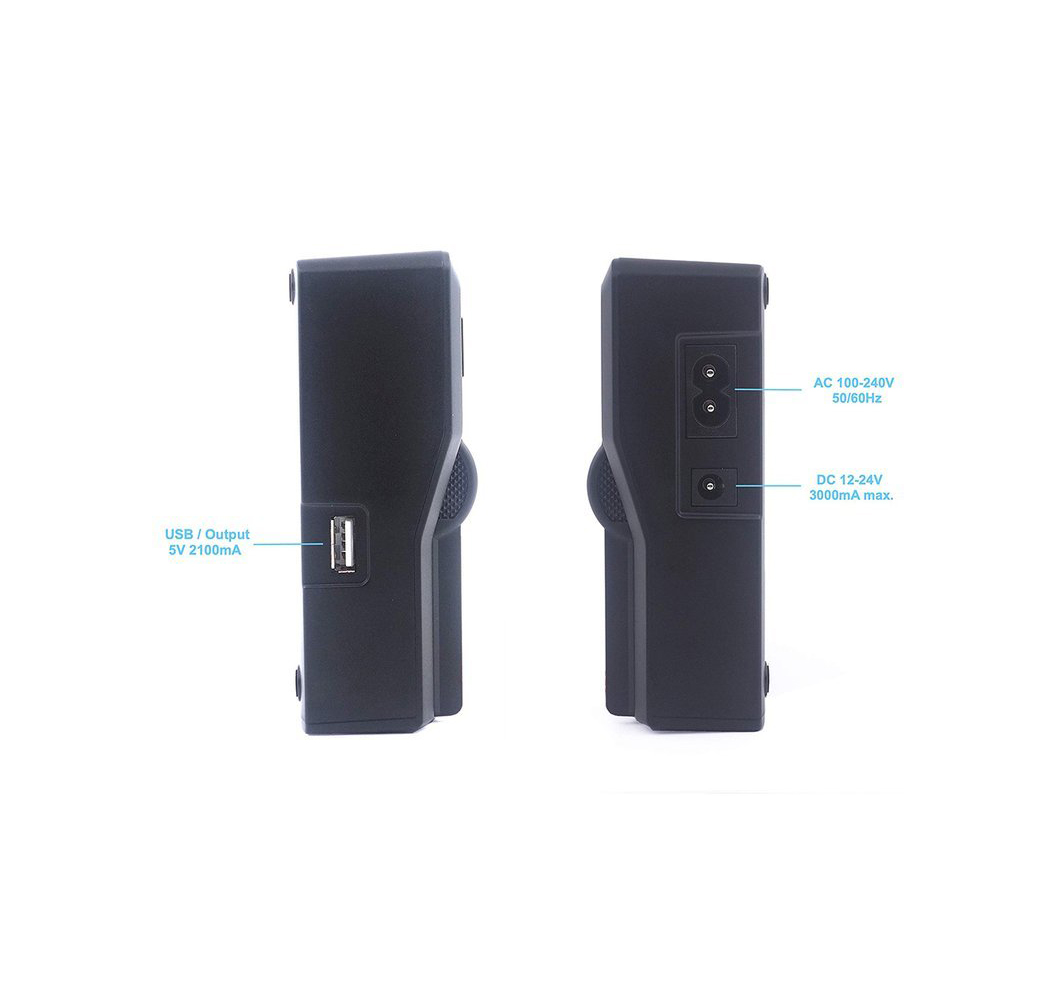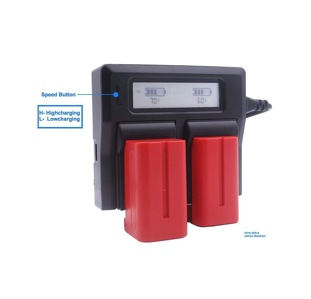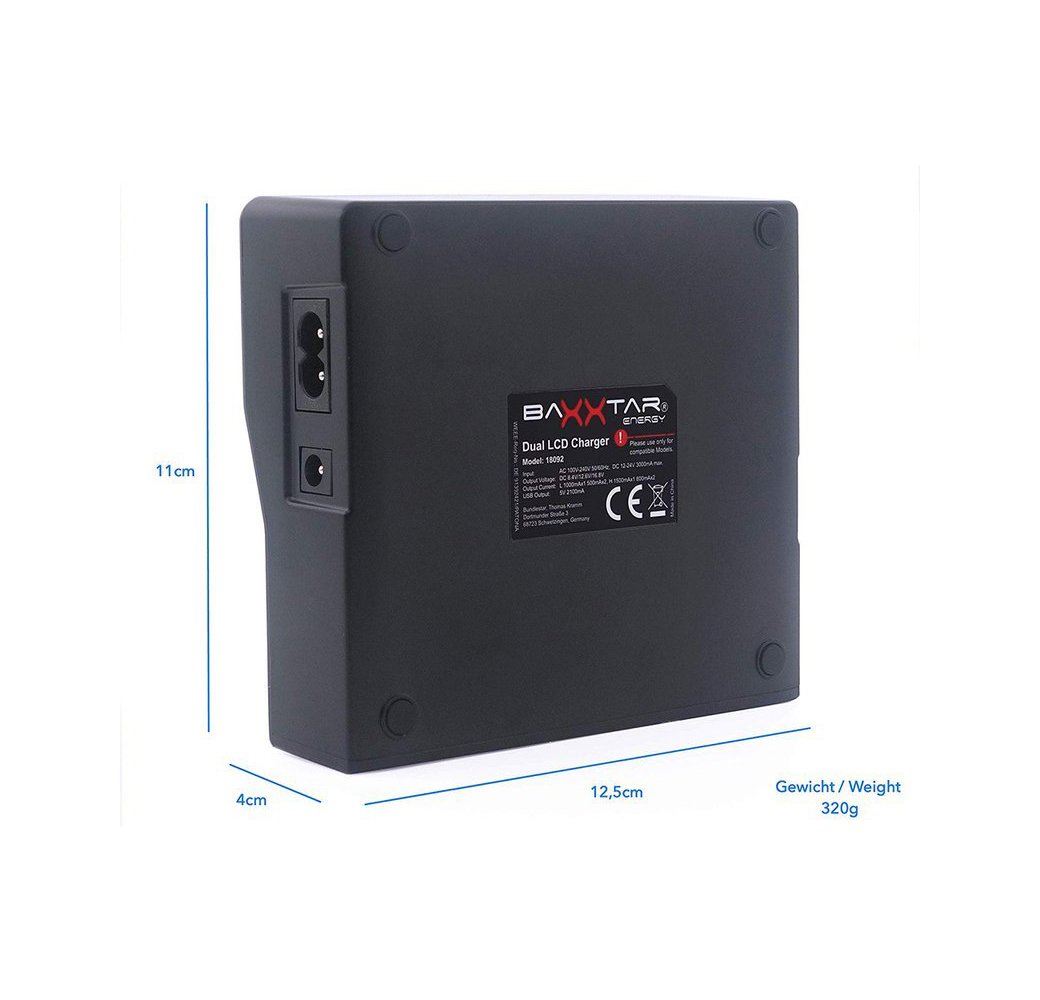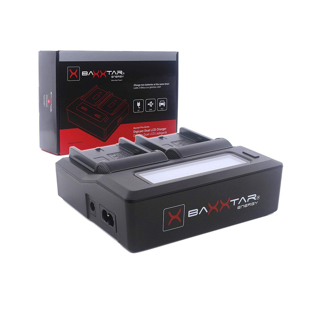 Das Baxxtar LCD Dual Ladegerät ermöglicht schnelles Aufladen von Sony NP-FM500H, NP-QM51, NP-QM71, NP-QM91, NP-F330, NP-F530, NP-F550, NP-F750, NP-F770, NP-960, NP-F970, NP-F980, NP-F990 Akkus. Es bietet zwei Ladegeschwindigkeiten und einen Turbo-Modus. Mit Vorladefunktion für tiefenentladene Akkus. Kompaktes Design mit separater Anzeige für jede Ladebucht. USB-Ausgang mit 2100 mAh zum Aufladen anderer Geräte. Maße: 125 x 110 x 40 mm, Gewicht: 0,32 kg. Lieferumfang: Ladegerät und Netzkabel. Ideal für Fotografen und Videofilmer unterwegs.